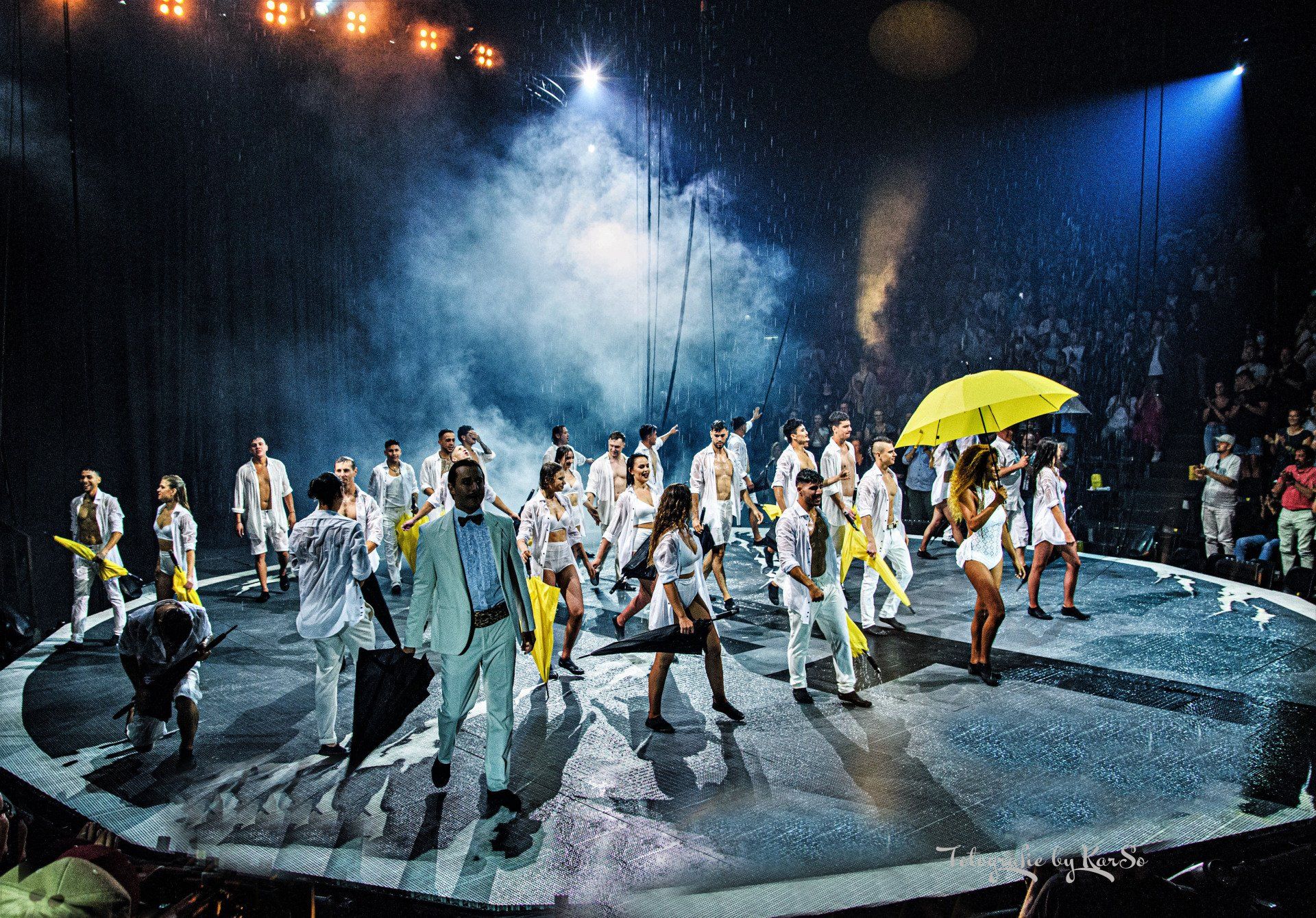 Am Ende der Show kommen die Artisten*innen und Comedians mit gelben und blauen Schirmen,