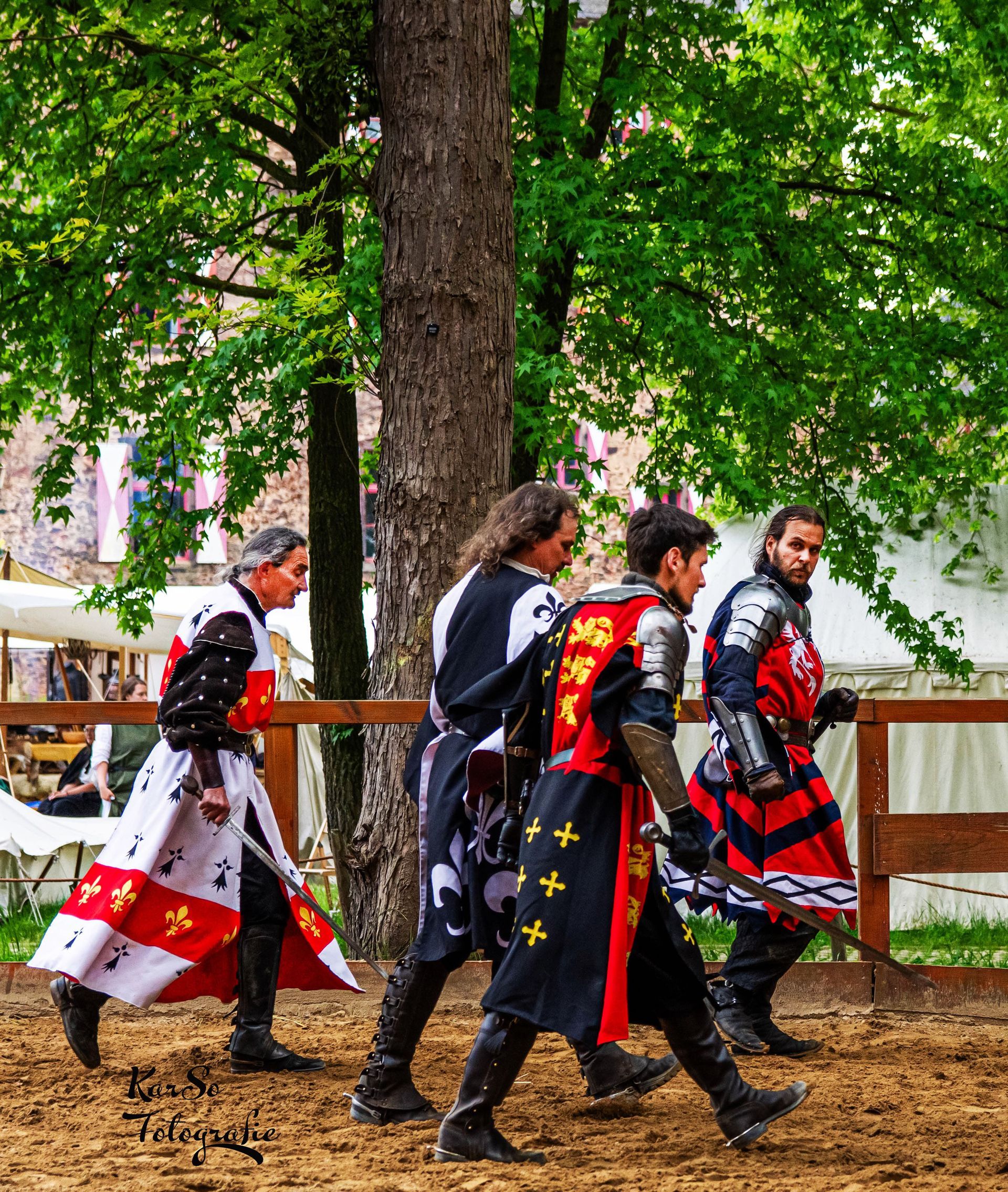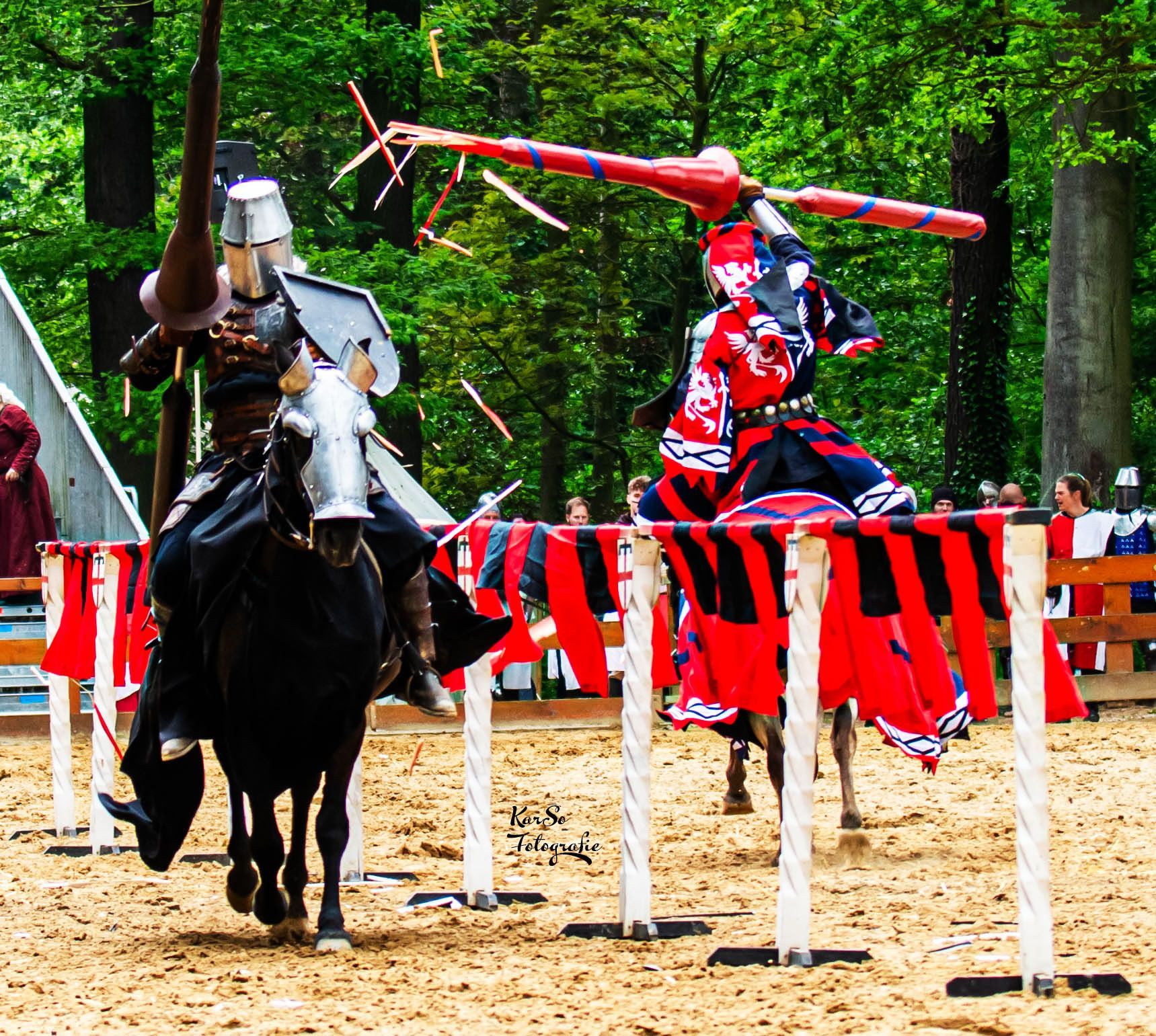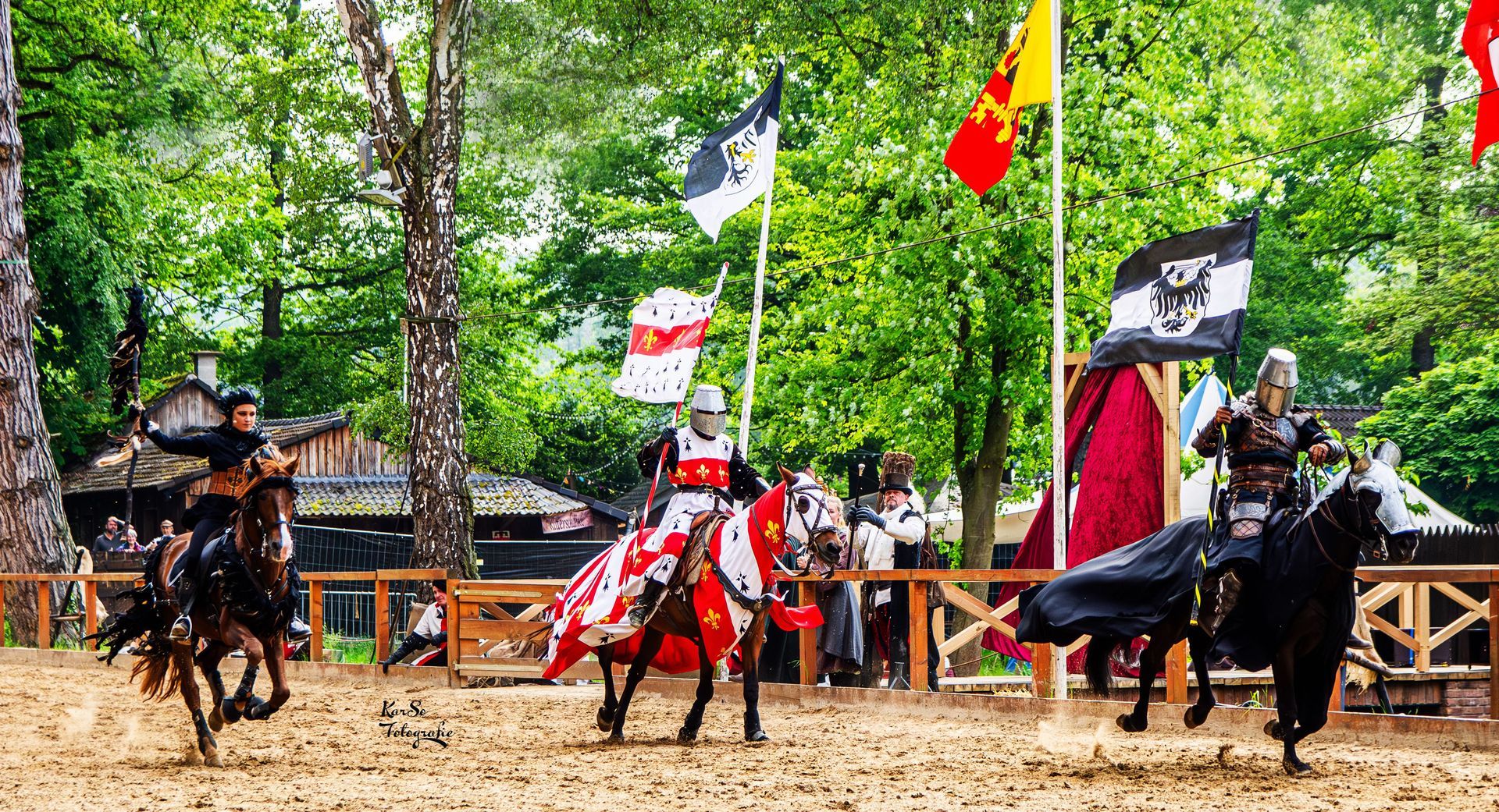 Dabei reiten zwei Ritter in voller Rüstung und mit stumpfen