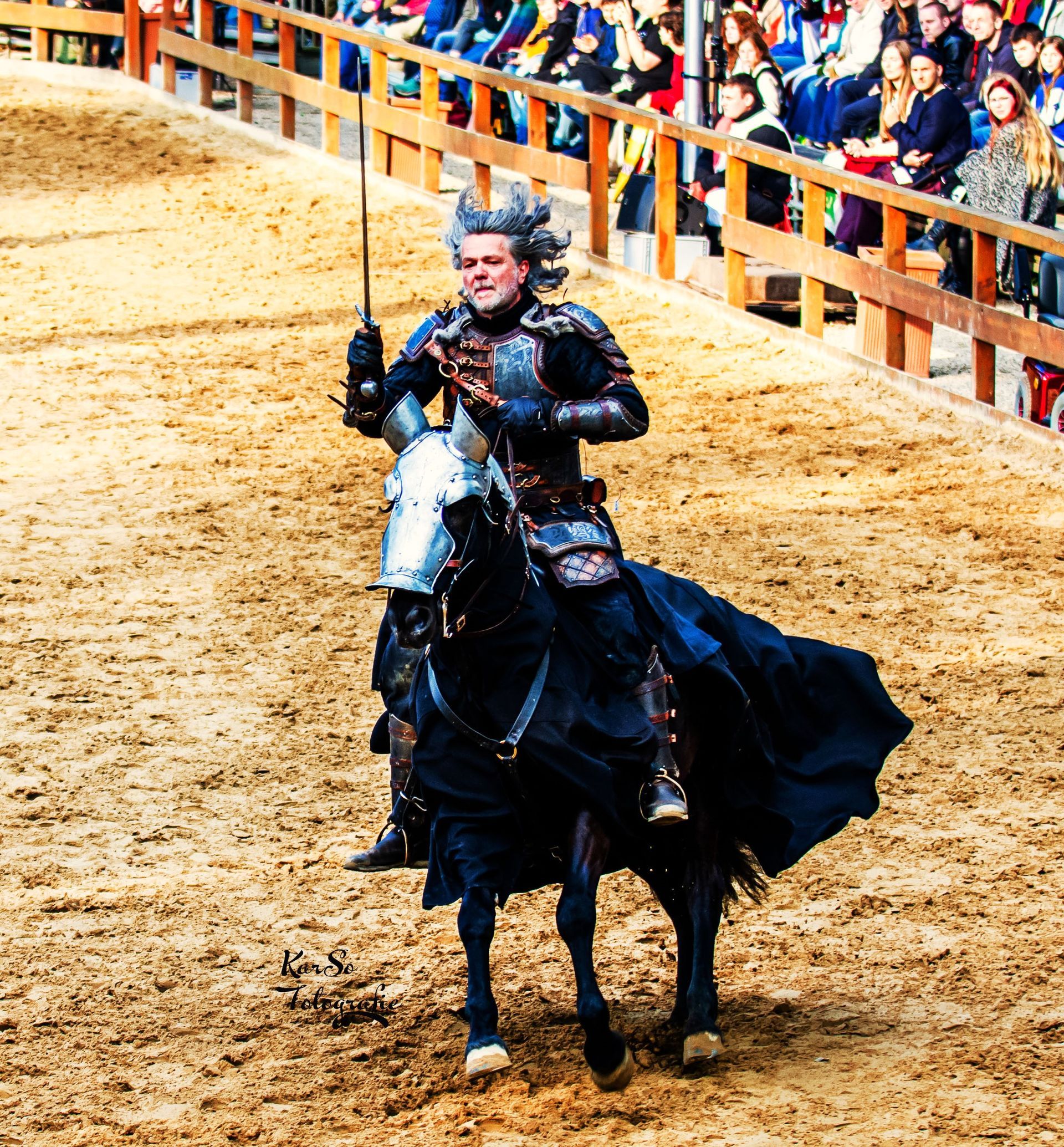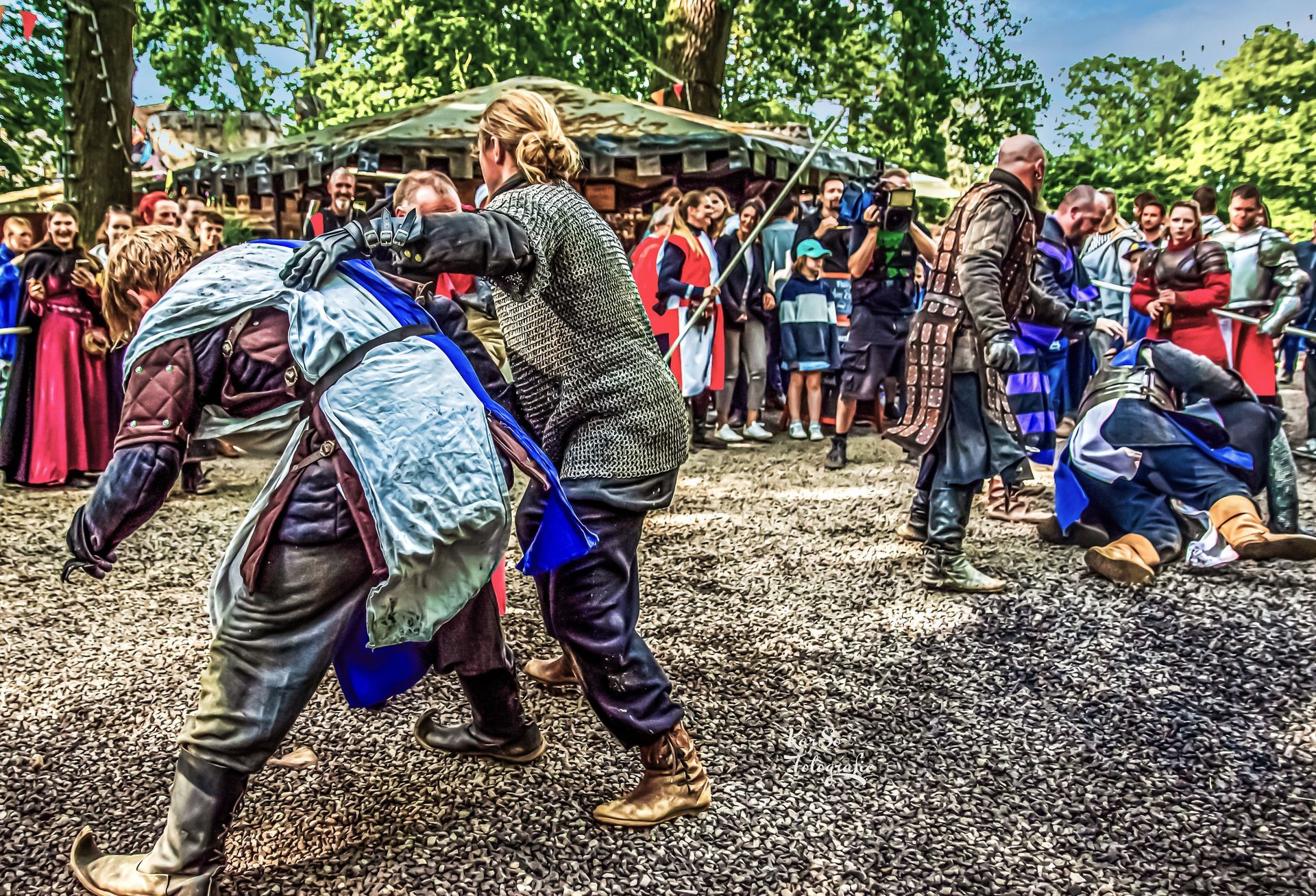 Lanzen jeweils rechts und links einer Beschrankung (Tilt), aufeinander zu, um durch einen gezielten Lanzenstoß den Gegner vom Pferd zu stoßen Und diesmal wird auch auf dem Boden noch weitergekämpft.