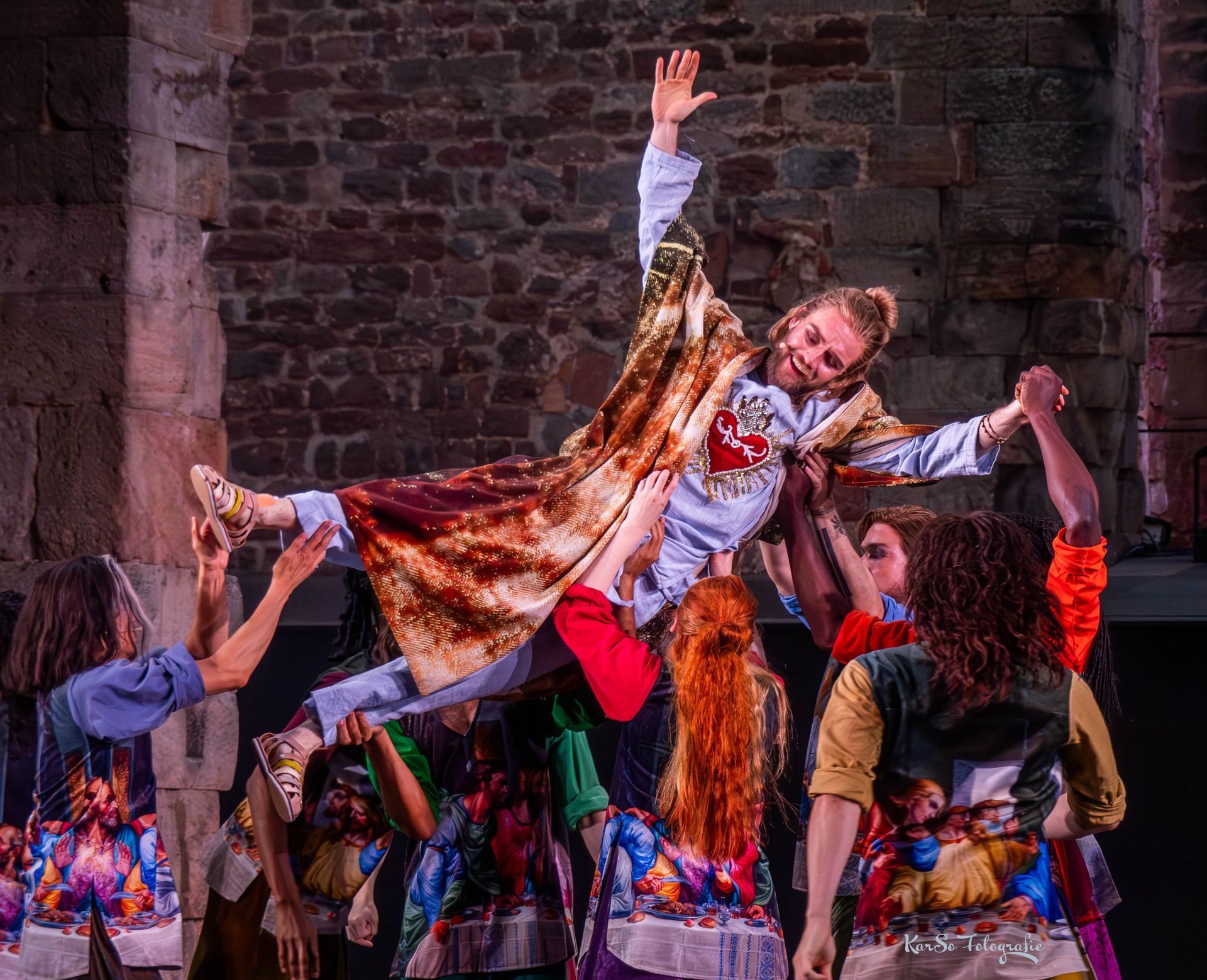 Jesus Christ Superstar selbst ist in einen Mantel gehüllt, der dem Turiner Grabtuch nachempfunden ist,