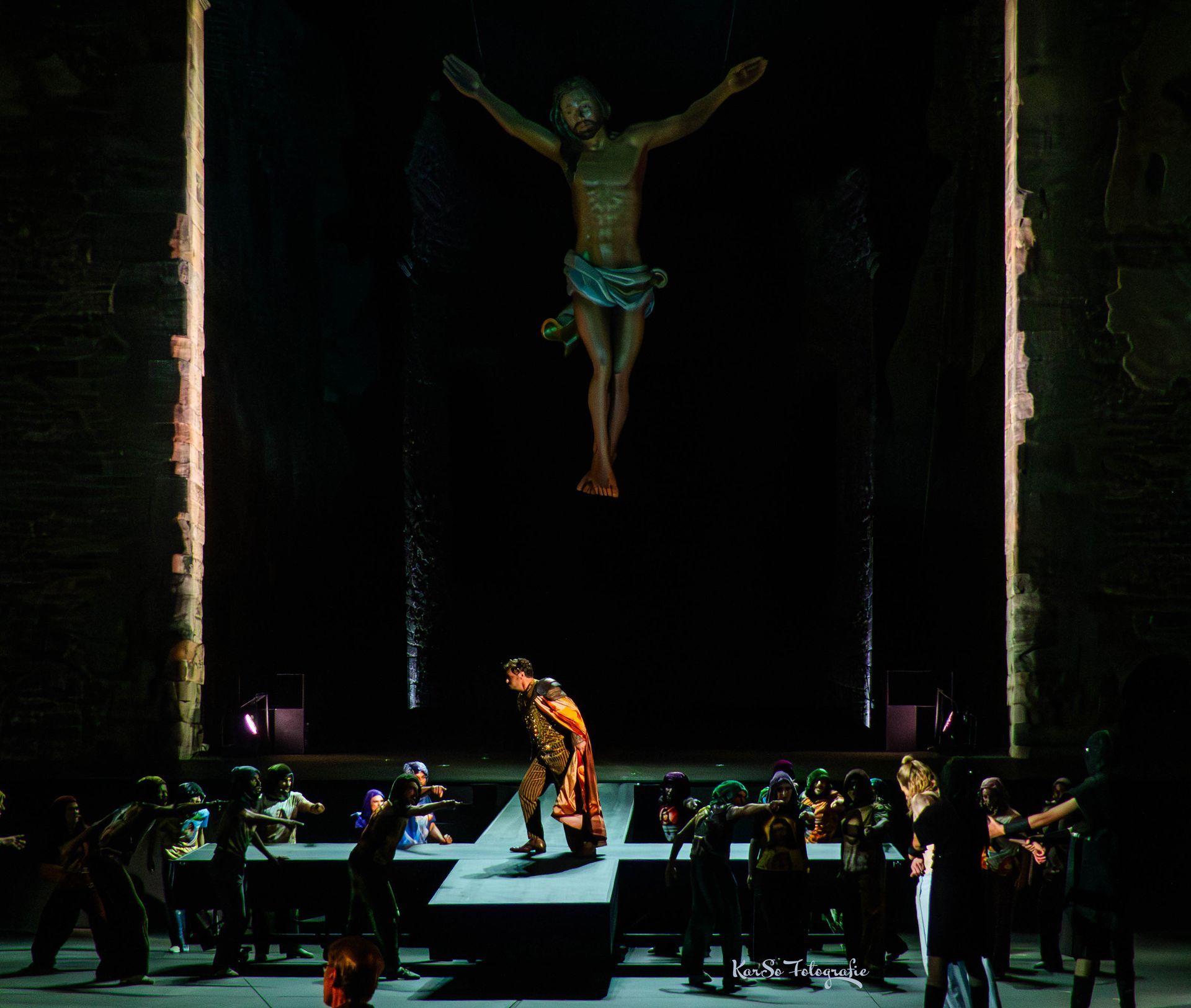 Überzeugend mit dunkel grollender Stimme umgeben von seinen schwarz gekleideten Pharisäern.