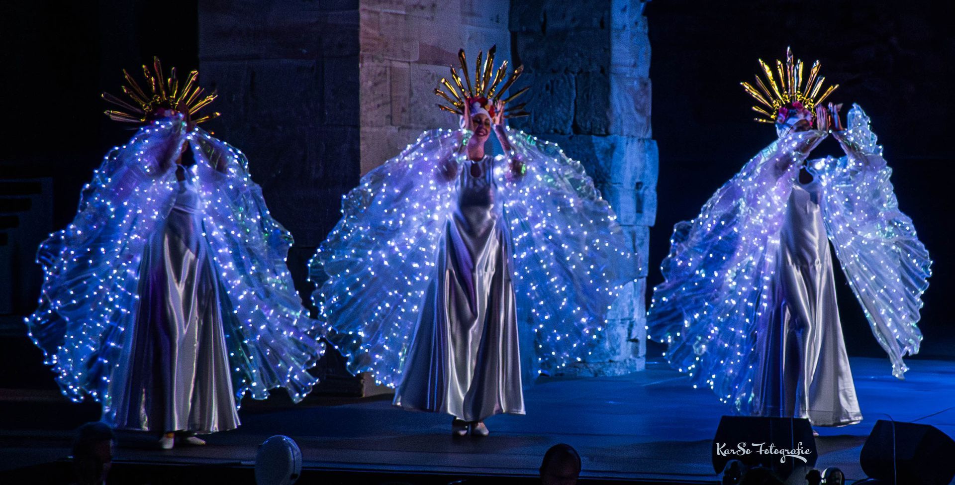 in tollen Kostüme, umgeben von einem spektakulären Bühnenbild,