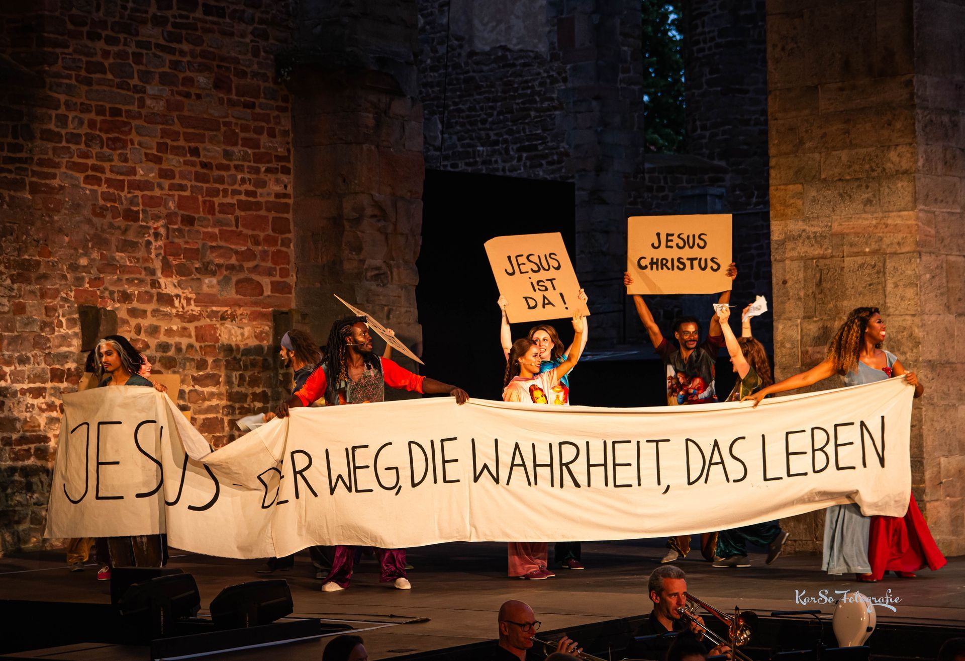 Aus der Apsis nähern sich die Apostel und stürmen auf die Bühne.