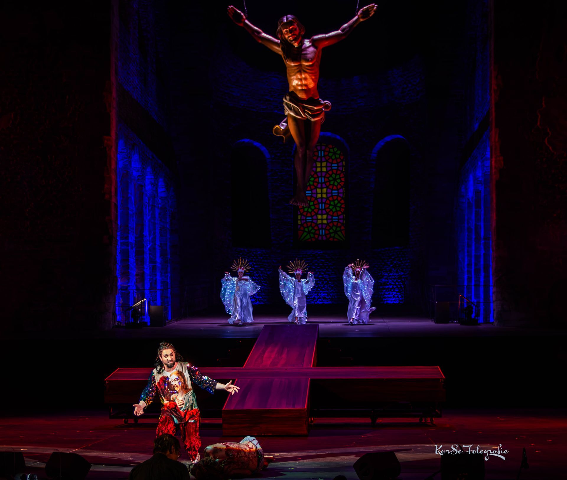 und das gewaltigen Kreuz, welches abwechselnd liegend als Tanzfläche und Tisch zum Abendmahl dient,