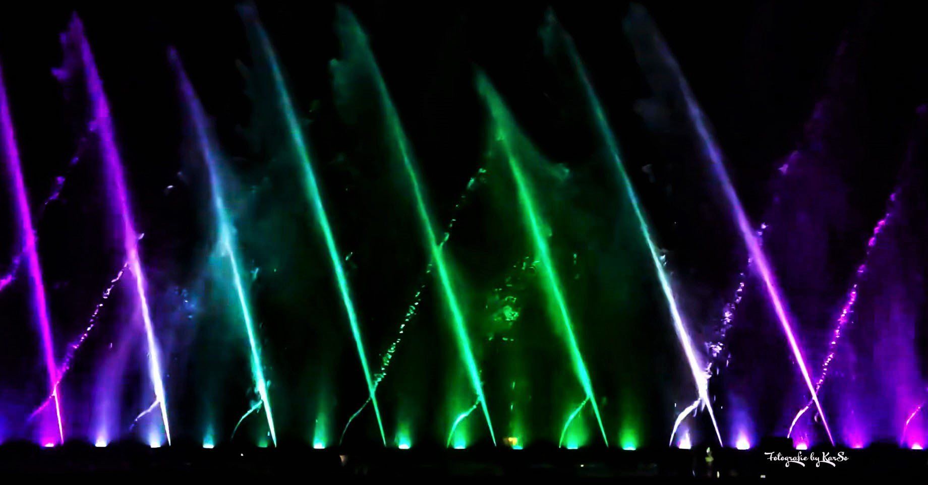 Sechzig bunte Scheinwerfer, setzen die teilweise bis zu 30m hohen Wasserfontänen, perfekt in Szene.