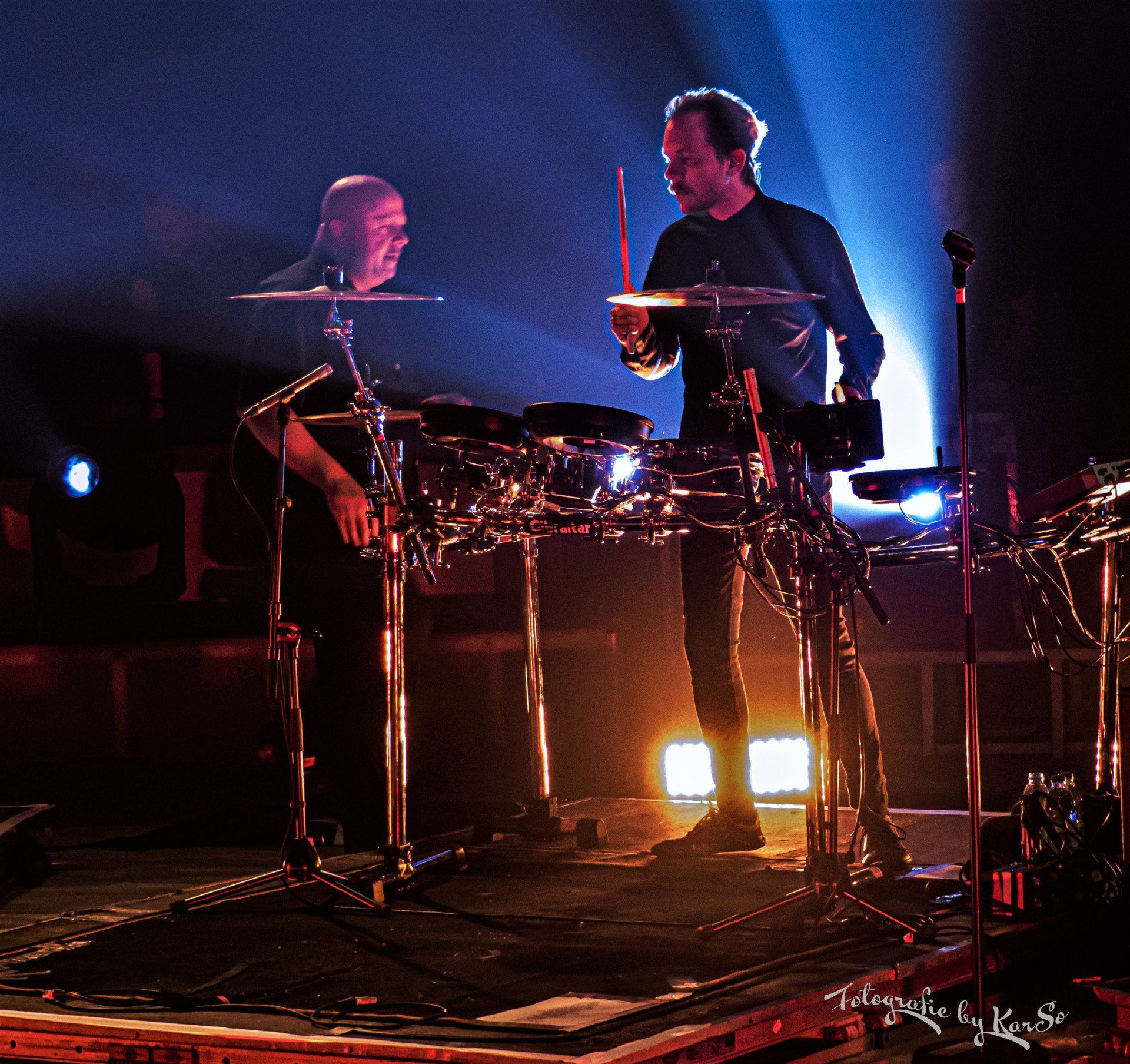 Det är mörkt och bara e-trummorna och de två tangentborden lyser diffust.
